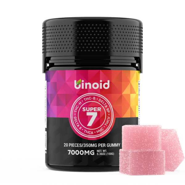 Binoid Super 7 Blend Gummies are one of our strongest gummies yet, utilizing a brand new gummy formulation, texture, and ability to fit a higher percentage of cannabinoids in each gummy. We infused 7000mg of our Super 7 Blend formula that combines premium THCA, THC-H, THC-B, Delta 9P, Delta 8, HHC, and THCV to give a well-rounded and powerful experience.